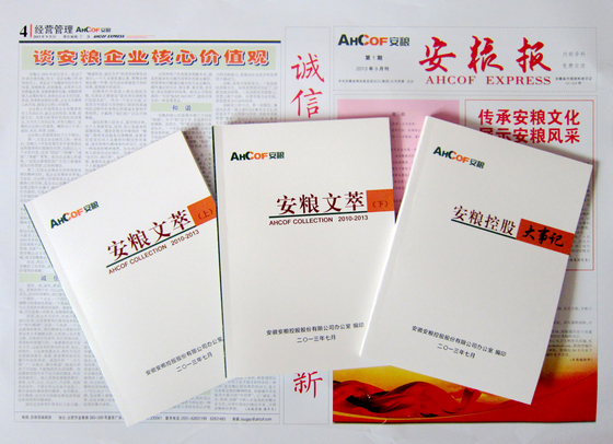 經省新聞出版局批準,9月中旬,公司內刊安糧報在試刊三期后正式創刊出版。國貿集團范陽董事長專門發來賀信,對安糧報創刊表示祝賀。同時,由辦公室編印的包括上級領導、安糧高管層和基層員工在公司網站發布的文章匯編——《安糧文萃》(上下冊)、內容包括各子公司三年來重大事項的資料記錄——《安糧控股大事記》,也印發至各單位。