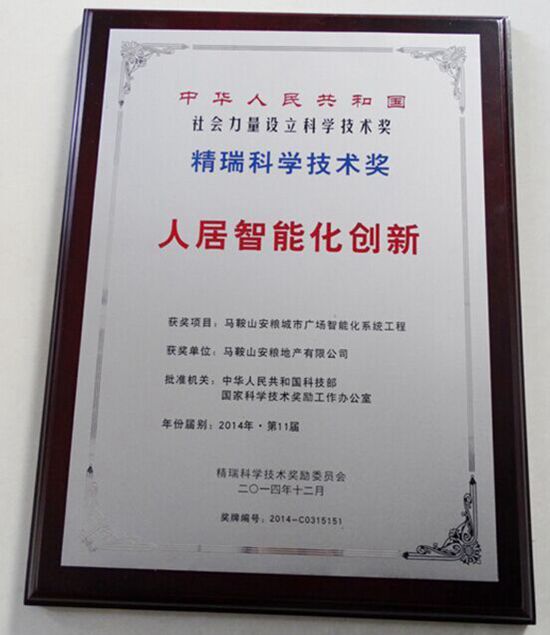 全聯房地產商會(原全國工商聯房地產商會)2014年度年會于2014年12月13-14日在北京召開,第11屆精瑞獎頒獎典禮同期舉行。我司“馬鞍山安糧城市廣場智能化系統工程”榮獲第11屆領先技術產品類精瑞獎。