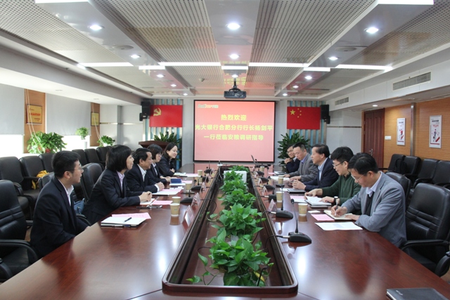 11月23日上午,光大銀行合肥分行行長楊劍平一行來公司調研指導,安糧集團黨委書記、董事長,安糧控股董事長、總裁曹訓立在公司22樓會議室接待了來賓并舉行座談。安糧集團總裁方宗友、安糧控股財務總監張來往等參加座談。