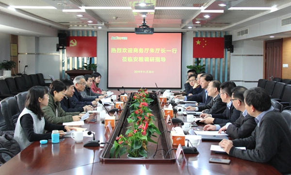 11月28日,安徽省商務(wù)廳朱丹副廳長(zhǎng)到公司開(kāi)展外貿(mào)工作調(diào)研,一同調(diào)研的有省商務(wù)廳貿(mào)發(fā)處、貿(mào)管處、產(chǎn)業(yè)處相關(guān)領(lǐng)導(dǎo)。國(guó)貿(mào)集團(tuán)黨委書(shū)記、董事長(zhǎng)范陽(yáng)率安糧集團(tuán)領(lǐng)導(dǎo)班子及貿(mào)易板塊主要負(fù)責(zé)人參加調(diào)研座談。