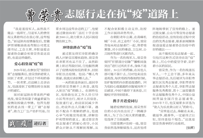 黃山人曾榮貴是安徽伊思頓糧油食品有限公司黨支部書記,他是一名傷殘退伍軍人,擔(dān)任阜陽益愛志愿者協(xié)會(huì)副會(huì)長(zhǎng),曾積極參與過大小百余次公益活動(dòng),被評(píng)選為“助人為樂黃山好人”稱號(hào)。在今年新冠病毒蔓延的特殊時(shí)期,曾榮貴不僅捐資戰(zhàn)“疫”,更沖鋒在前。正月初一,他就協(xié)同當(dāng)?shù)卮鍍晌e極投入到防控疫情一線,白天走進(jìn)村委會(huì)和公共場(chǎng)所開展防疫消毒,幫助村兩委工作人員開展出入人員管控;晚上編輯公眾號(hào)文章,宣傳防疫活動(dòng)和防疫過程中的好做法,用行動(dòng)踐行了共產(chǎn)黨員的初心使命,發(fā)揮了黨員的先鋒模范作用。