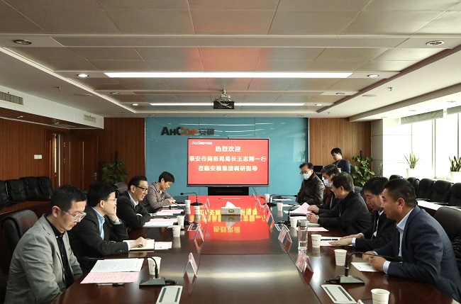 3月12日上午,山東省泰安市商務局局長王志翔一行來訪。安糧集團副總裁周洪熱情接待了王志翔局長一行,安糧實業相關領導及業務部門負責人參加調研座談。