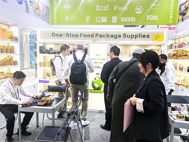 在全球化與個(gè)性化的雙重驅(qū)動(dòng)下,消費(fèi)者對(duì)產(chǎn)品的需求日益多樣化。本期會(huì)展安糧積極擴(kuò)充產(chǎn)品規(guī)格,豐富產(chǎn)品種類,帶來(lái)了深受客戶喜愛的全降解紙杯、紙刀叉、紙質(zhì)蘸料杯等一次性日用品。尤其是本次推出的以竹、木、甘蔗渣等為原材料的新產(chǎn)品輕食盒,在開展當(dāng)天吸引了一大批歐美客戶的咨詢。