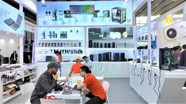在電子消費品類展區,安糧推出了不同款式的散熱機箱,再加上融入人體工程學設計的配套鍵鼠,能滿足不同PC DIY的需求。此外,大容量、多接口、充電快的移動電源,也引得不少意向客戶紛紛下訂。